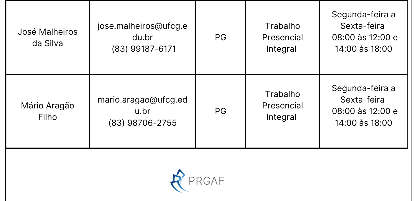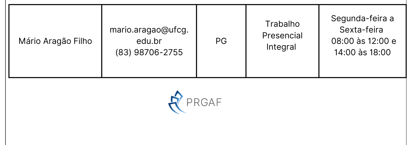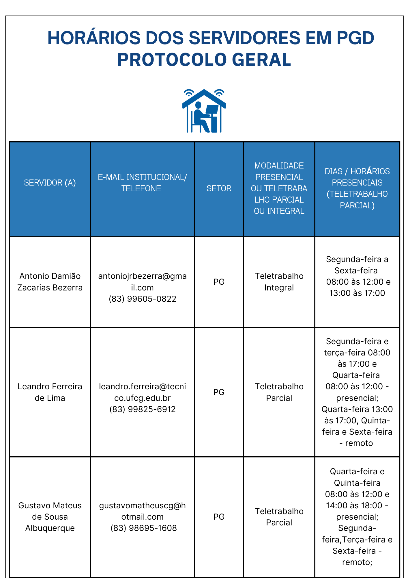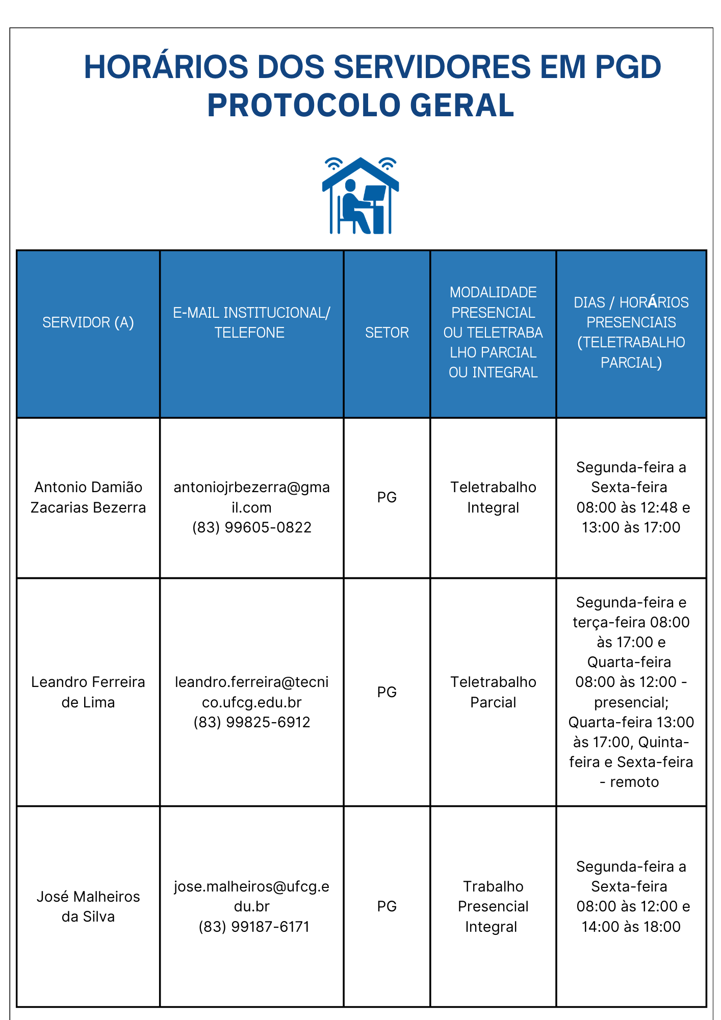 Planilha com os horários dos servidores do Protocolo Geral que estão na modadlidade presencial e telepresencial.