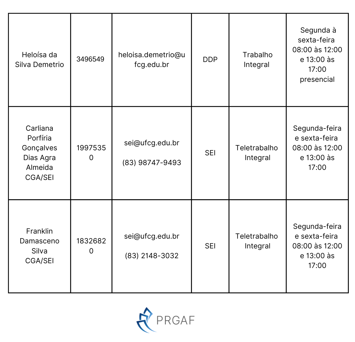 Planilha com os horários dos servidores da Pró-Reitoria de Gestão Administrativo-Financeira - PRGAF e da Coordenação Geral de Adminitração que estão na modadlidade telepresencial.